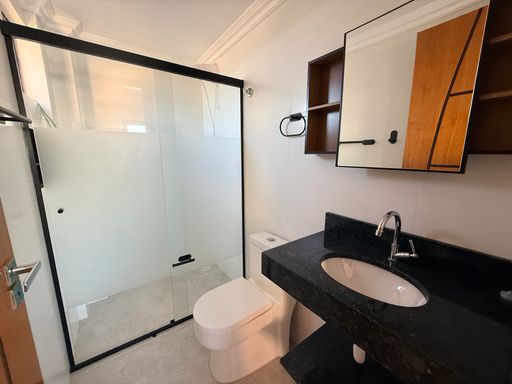 Banheiro de Alto Padrão: Cuba de sobrepor, metais modernos e box em vidro temperado.